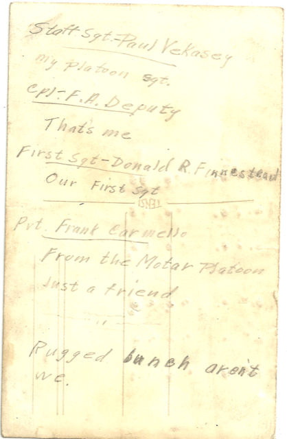 | From: David Deputy Date: February 6th, 2006 E-mail: deputydawg@uci.net I have been looking for any information about my grandfather Sgt. Frank (Bud) Deputy. I know very little about his time in the service and I would be interested in any information known about him. I have included a photograph of him taken at Ft. Lewis, Washington. You are welcome to use the picture on the site if you choose. Thank you for the work you have done on the site, I have enjoyed learning about the men my grandfather served with. |
