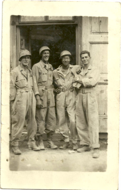 | Date: April 5th, 2018 Dave Deputy, grandson to Cpl Frank Deputy, would like to share this photo with the 756th Tank Battalion community. The photo back identifies the four men standing (left to right) as: Staff Sgt Paul Vekasey, Cpl F.A. Deputy, 1st Sgt Donald R Finnestead, and Pvt Frank Carmello. |