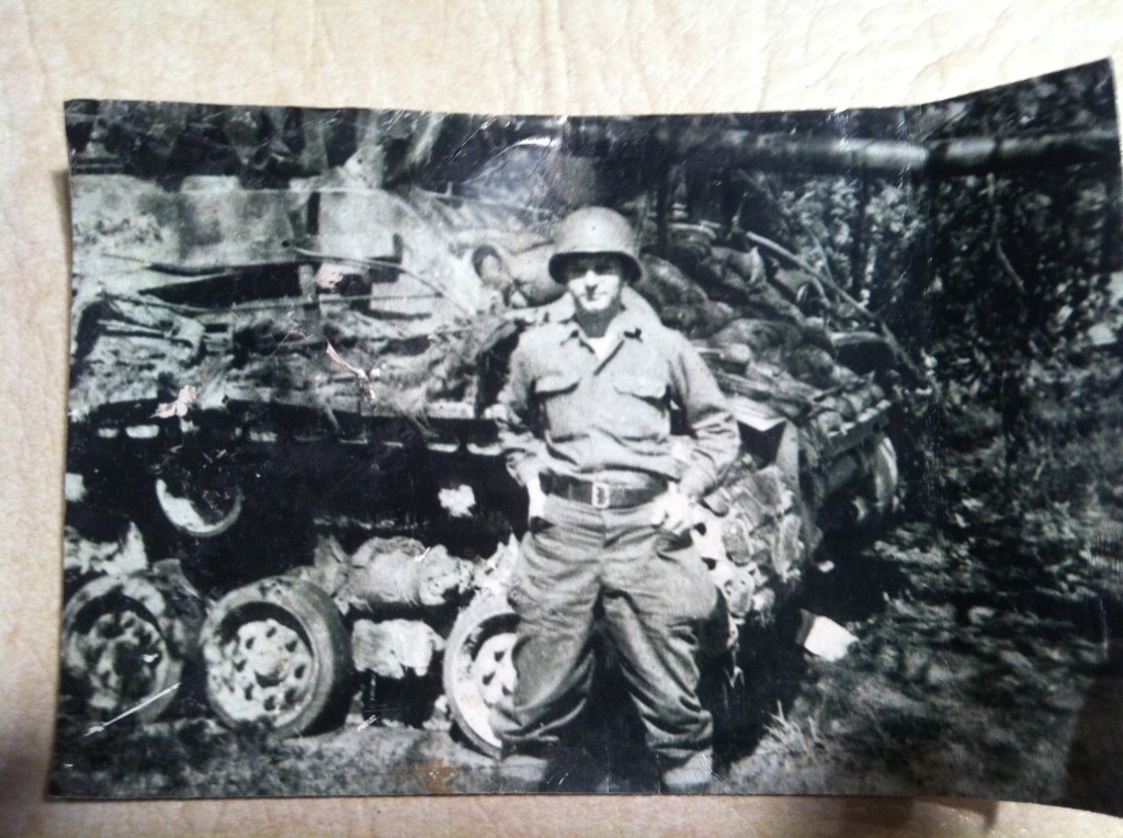 | Date: June 4th, 2014 Kyle Leonard, the great grandson of Pvt Raymond E. Leonard of the 756th Tank Battalion, would like to share this photo of his great grandfather. This appears to have been taken sometime in Germany in 1945 The tank behind Pvt Leonard is an M4A3E8. The sandbags are to help prevent panzerfausts from penetrating the armor. This photo survived a tornado that hit Leonard Illinois earlier this year… |